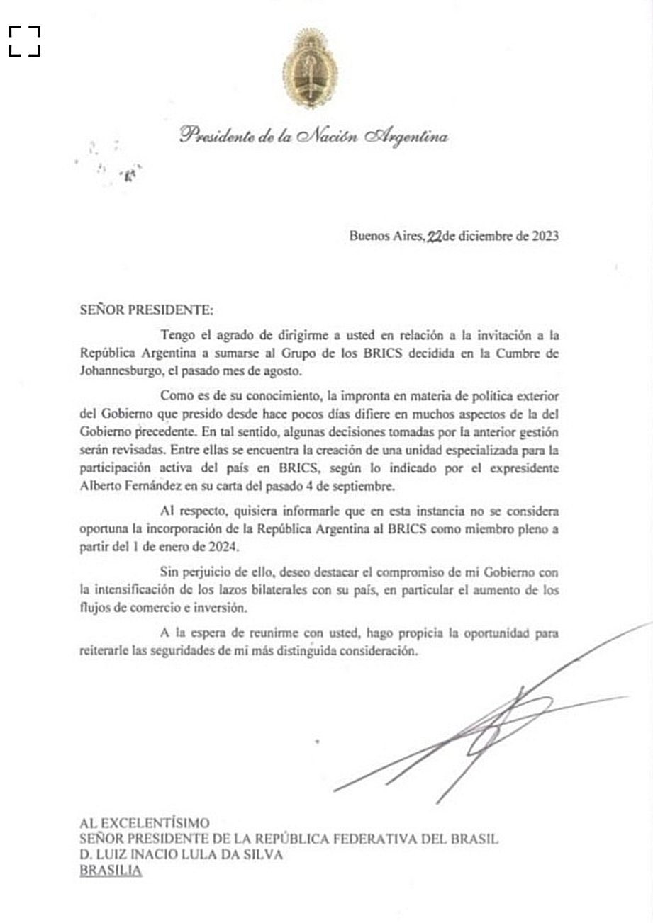 Contudo, o cenário eleitoral mudou tudo e o novo presidente do país, Javier Milei, acaba de anunciar que a Argentina não fará mais parte do bloco.