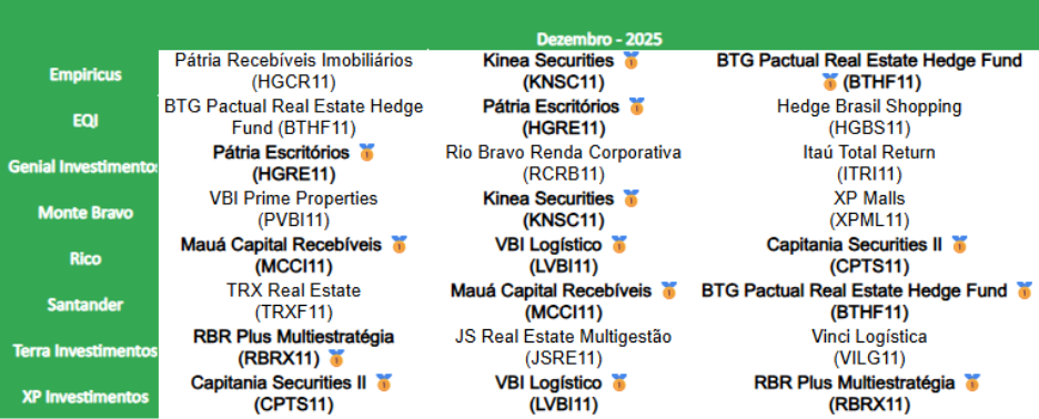 Com a saída do FII do ranking, os ativos que disputam o primeiro lugar são: BTG Pactual Real Estate Hedge Fund (BTHF11), Capitania Securities II (CPTS11), Kinea Securities (KNSC11), Mauá Capital Recebíveis (MCCI11), Pátria Escritórios (HGRE11), RBR Plus Multiestratégia (RBRX11) e VBI Logístico (LVBI11). Confira o ranking dos fundos imobiliários favoritos para dezembro: