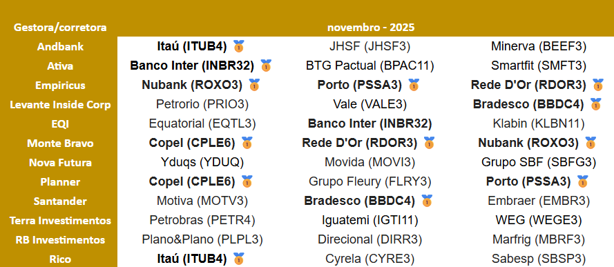 Todos disputam o primeiro lugar com o Itaú ao também conquistarem duas indicações no mês. Confira o ranking completo das ações mais recomendadas de novembro entre os 12 bancos e corretoras consultados pelo Seu Dinheiro: