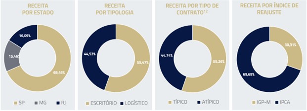 No que diz respeito às receitas, aproximadamente 55,5% decorrem do setor de escritórios, enquanto o restante vem dos galpões logísticos. Cerca de 45% dos contratos do fundo estão estruturados na modalidade atípica, o que confere maior previsibilidade ao fluxo de receitas.