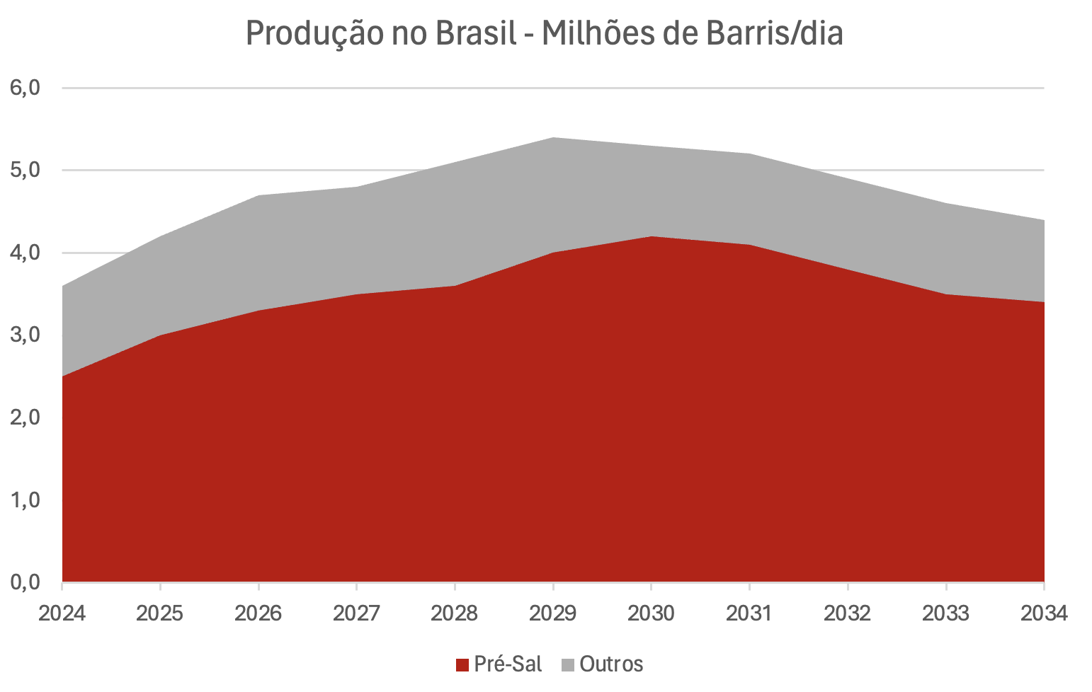 O gráfico abaixo mostra a curva de produção esperada de produção de óleo no Brasil, que deve começar a cair a partir da próxima década por conta do declínio natural dos campos, principalmente no pré-sal.
