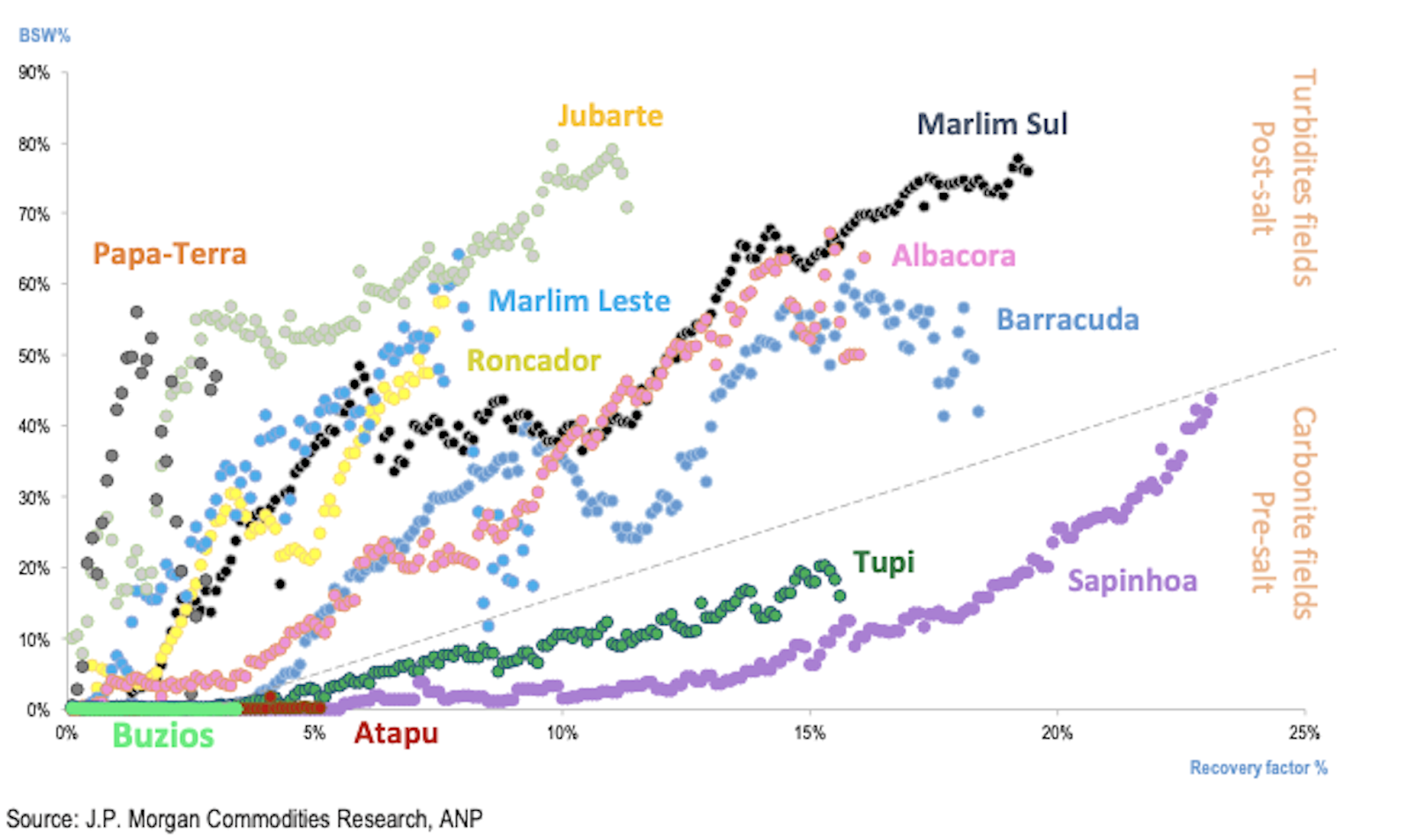 O eixo vertical mostra a porcentagem de sedimentos básicos e água (BSW) na produção, enquanto o eixo horizontal mostra o fator de recuperação de óleo naquele campo.