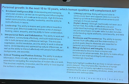 Diante de tantas mudanças, o que vai resistir? Quais qualidades pessoais serão preservadas nesse novo ambiente? A imagem abaixo oferece um bom resumo. Inteligência emocional, liderança, habilidades interpessoais e colaborativas, pensamento crítico, capacidade de aprendizado constante, treinamento digital (no sentido da possibilidade de conversar com as ferramentas de IA), resiliência e integridade devem ser valorizados.