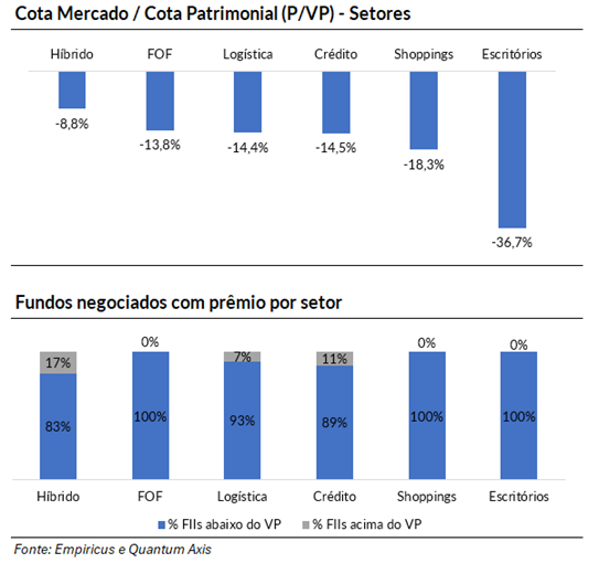Ao lado deste fator de incerteza, é preciso citar que as cotas dos FIIs seguem com descontos atualmente. Em alguns segmentos do Ifix, como shoppings e escritórios, todos os integrantes negociam com P/VP abaixo de 1.