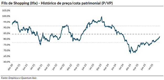 O reflexo dessa solidez ficou evidente no desempenho das cotas: a composição de FIIs de shoppings presentes no Ifix entregou um retorno médio superior a 20% no ano, resultado que sintetiza a combinação entre múltiplos comprimidos, fundamentos robustos e melhora das expectativas macroeconômicas.