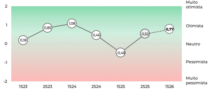 A projeção favorável é compartilhada pelos integrantes do mercado. De acordo com a mais recente Pesquisa com Gestores da Empiricus, o grau de confiança das casas para o mercado local permaneceu em patamar otimista, com leve alta em relação ao 2S26.
