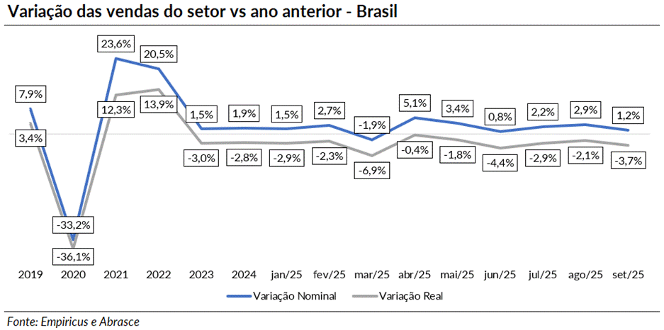 O gráfico acima ilustra bem essa dinâmica: enquanto as vendas nominais avançaram de forma moderada durante boa parte do ano, a variação real (que desconta a inflação) mostrou comportamento mais volátil, registrando quedas consecutivas em diversos meses.