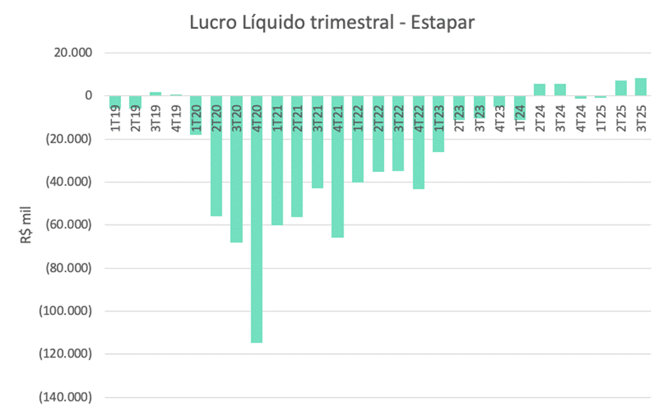 Como já mencionei, atualmente a Estapar possui um prejuízo acumulado bilionário. Em nossas projeções orgânicas ela precisaria de mais 8 anos para conseguir zerar esse saldo negativo e, enfim, poder começar a distribuir dividendos.