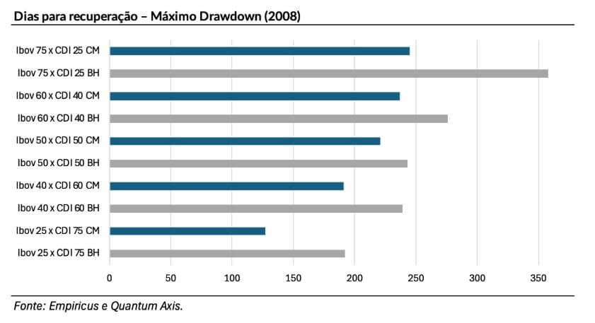 É verdade que parte desse ganho teórico pode ser consumida por custos operacionais, não incluídos na análise. No entanto, há um aspecto relevante a se destacar: em cenários de fortes quedas, as carteiras balanceadas tendem a apresentar recuperação mais rápida do que aquelas que permanecem estáticas. Este é um efeito prático de “comprar na baixa”.