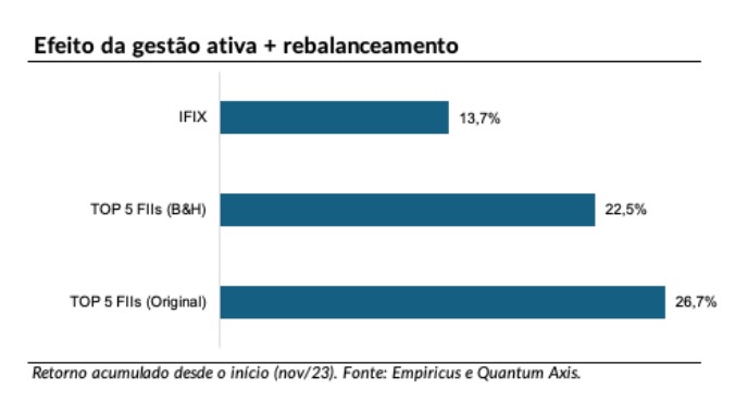Para ilustrar de forma prática o efeito do rebalanceamento de carteira, aliado à atuação da gestão ativa, podemos olhar para a Carteira Empiricus TOP5 FIIs como um breve exemplo.