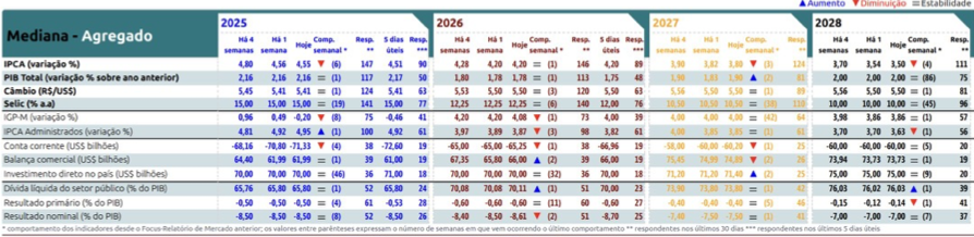 Esse cenário ganha respaldo no próprio relatório Focus. Embora a inflação ainda esteja elevada e o mercado de trabalho mostre resiliência, o ponto mais relevante das últimas semanas foi a redução nas expectativas de longo prazo, para 2027 e 2028.