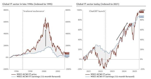 Daí, podemos depreender que se tratam de fenômenos genuinamente díspares, com perfis de risco quase que incomparáveis. Ambos, naturalmente, derivam de inovações tecnológicas, mas isso não basta para colocá-los em uma mesma caixa; o Global IT Sector dos anos 1990 não é uma boa proxy deste Global IT Sector de 2025.