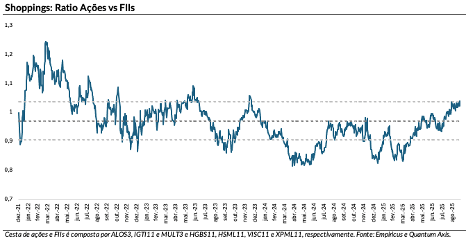 Após um primeiro semestre excepcional para os players, impulsionado por um ambiente econômico mais favorável à Bolsa e por um desempenho de vendas acima da média, as ações acumularam alta de cerca de 45% em nove meses — mais do que o dobro da valorização observada nos FIIs de shoppings. Como consequência, o ratio entre as duas classes sofreu uma mudança significativa no período.