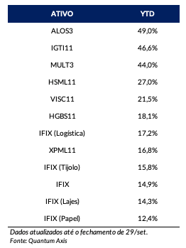 Vale citar que, na última semana, foi divulgada alteração no texto da Medida Provisória 1.303/2025, que trata da tributação de investimentos antes isentos, como LCIs, LCAs, CRIs, CRAs, FIIs, Fiagros, FI-Infras e debêntures. Na prática, o texto atualizado manteve a isenção de IR para pessoas físicas nos fundos imobiliários, desde que observadas as condições já conhecidas, como número mínimo de cotistas e negociação em bolsa. Com o tema mais sensível retirado da pauta, os FIIs voltam ao radar dos investidores.