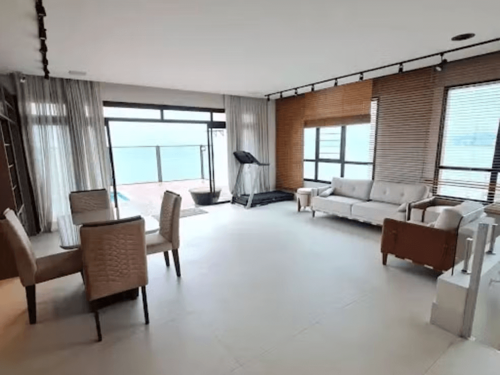 “Ideal para viver experiências únicas com família e amigos”, é assim que uma das imobiliárias se refere ao imóvel. O apartamento é uma cobertura duplex, com 374m², três suítes, seis banheiros, dois lavabos, dois closets e uma piscina privativa.