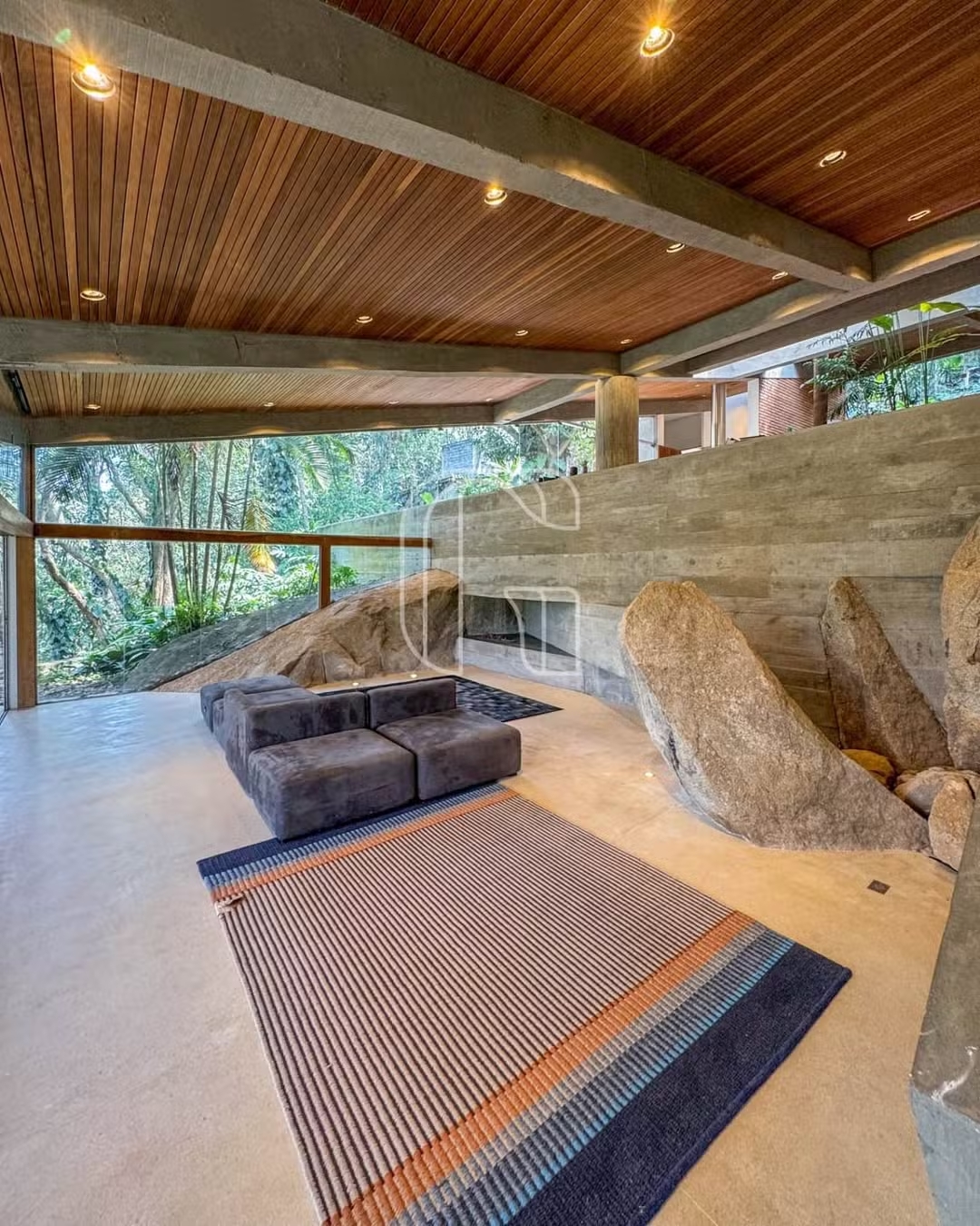 A arquitetura segue uma estética modernista-rústica típica dos anos 70: vãos amplos, integração com a natureza, paredes em pedra natural e muita madeira.