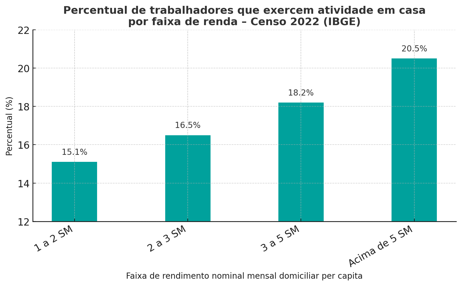De acordo com o Instituto Brasileiro de Geografia e Estatística (IBGE), 20,5% dos brasileiros com renda domiciliar per capita acima de cinco salários mínimos — o equivalente a cerca de R$ 7,5 mil em valores de outubro de 2025 — trabalham em casa ou na própria propriedade.