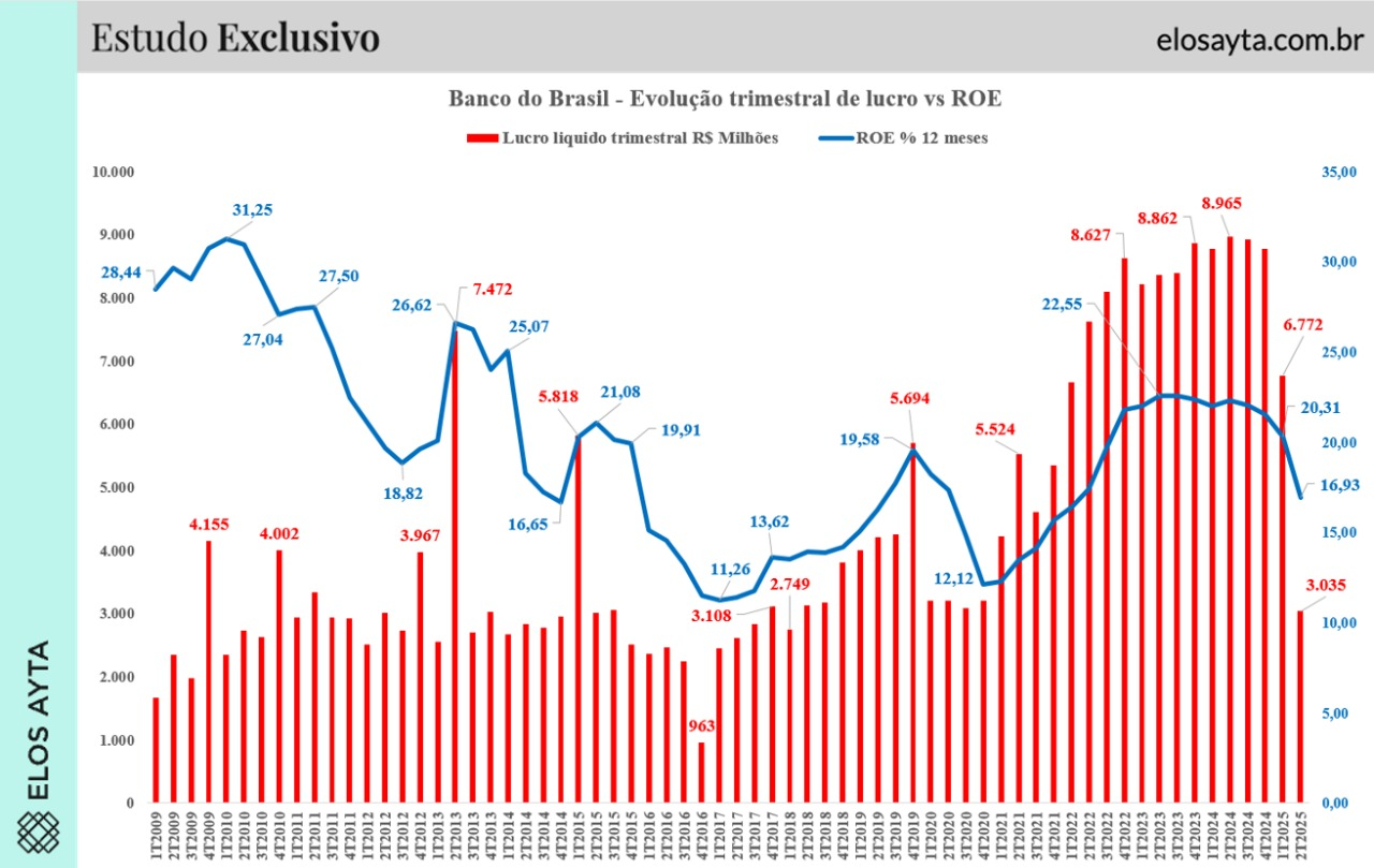"Foi praticamente o mesmo lucro apresentado no trimestre anterior, só que o ROE também assusta. O Banco do Brasil, que já vinha sendo observado pelos analistas com bastante problema, e agora acaba de apresentar mais um: a carteira de crédito cresceu, puxada por dois segmentos que me preocupam muito. pessoa física e pessoa jurídica", disse o analista, destacando o temor em relação à inadimplência.