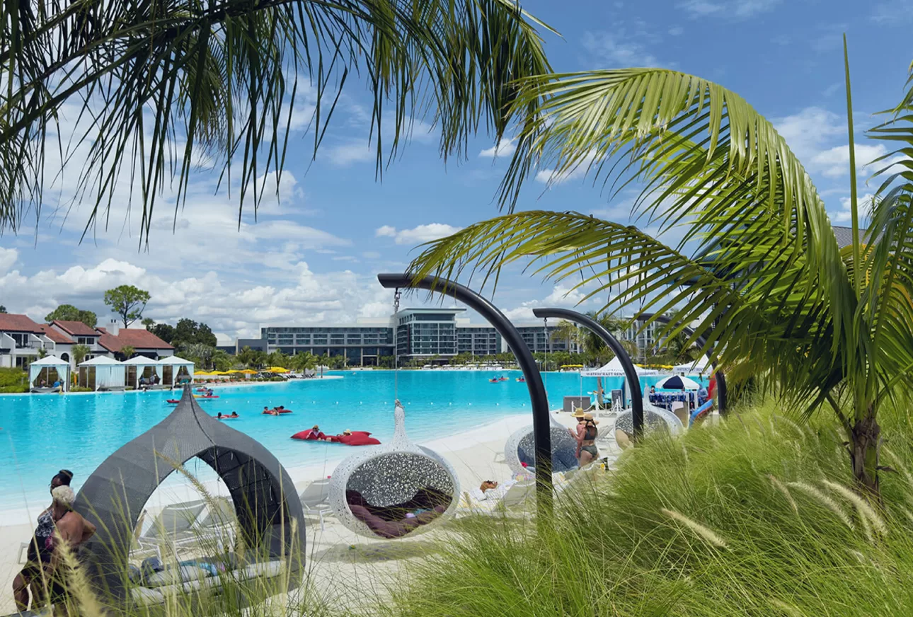 Ao redor da piscina há uma praia artificial com 12 mil metros quadrados de areia.