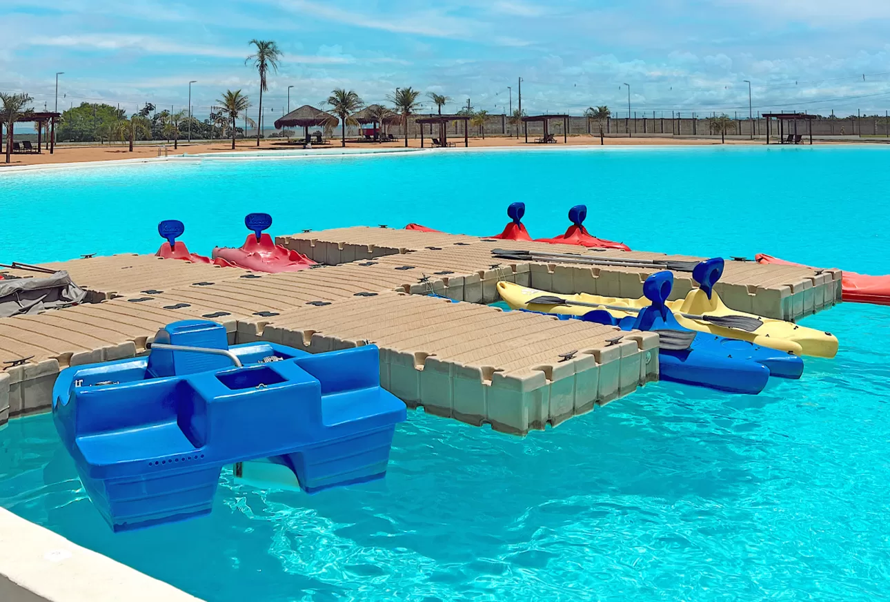 A estrutura não serve só para admirar. Os moradores do condomínio podem praticar esportes náuticos leves nela, como pedalinhos, caiaques e stand up paddle.