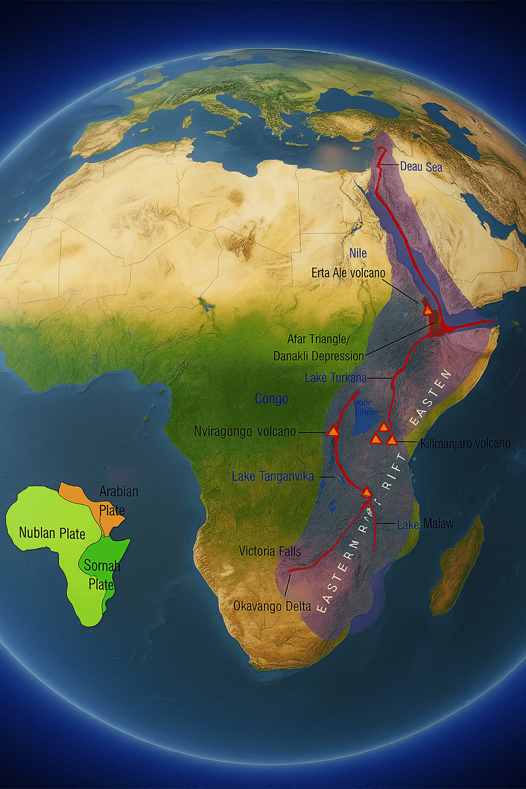 Um novo oceano pode surgir na África, começando na Etiópia e avançando por países como Quênia, Tanzânia, Moçambique e África do Sul até transformar parte do continente em uma imensa ilha