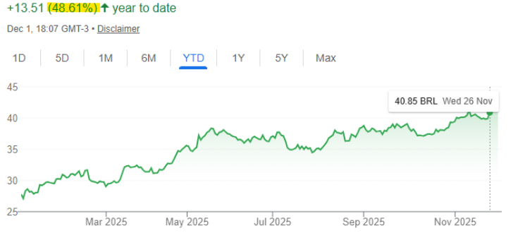 Segundo o banco de investimentos, o Itaú fez parte da carteira por um longo período e teve um desempenho muito forte no acumulado do ano. Ao todo, os papéis ITUB4 tiveram alta de 48,61% em 2025, segundo dados do Google Finance: