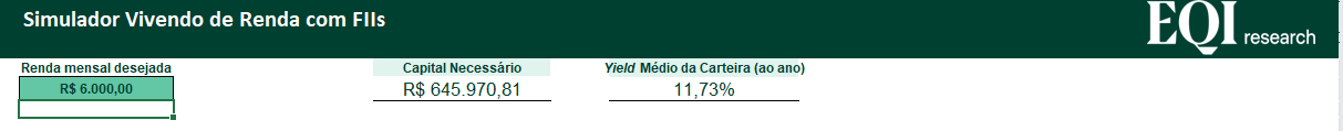 Com o simulador Vivendo de Renda com FIIs da EQI Research, você determina o valor da renda mensal que deseja alcançar e, em seguida, a ferramenta calcula automaticamente quanto você deve investir e como distribuir os seus recursos para atingir o objetivo.