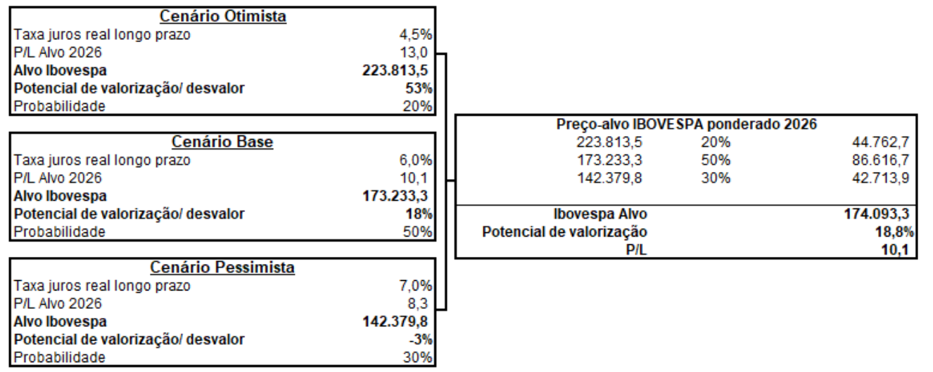 Segundo o cenário-base dos especialistas, o preço-alvo do Ibovespa para 2026 está acima dos 170 mil pontos, o que significa uma alta de cerca de 10% em relação ao patamar atual.