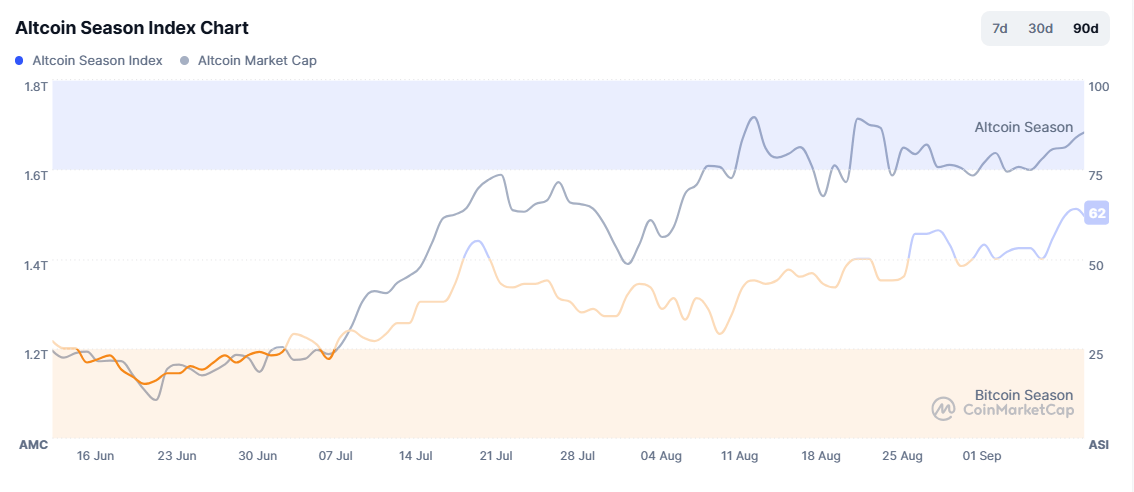 O gráfico mostra o índice que mede a probabilidade de uma altseason. E, como é possível observar, o cenário aponta que um destes momentos de forte valorização está se aproximando para as altcoins.