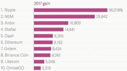 Em 2017, por exemplo, a Ripple foi a grande protagonista, com uma valorização estrondosa de 36.018%. O suficiente para transformar um investimento de R$ 1 mil em até R$ 361 mil. Veja as maiores valorizações do período: