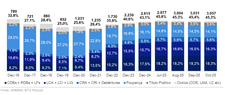 Em outubro de 2025, o percentual de alocação em ativos como CDBs, RDBs e Letras Financeiras, e em LCAs, LCIs e LIGs eram maiores do que a posição em poupança, segundo dados do BTG.