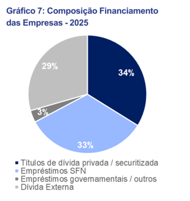 De acordo com dados do Banco Central, os títulos de dívida privada (debêntures, Notas Comerciais, CRI, CRA e direitos creditórios na carteira do FIDCs) representam 34% do financiamento total das empresas, frente a 33% de empréstimos por bancos.
