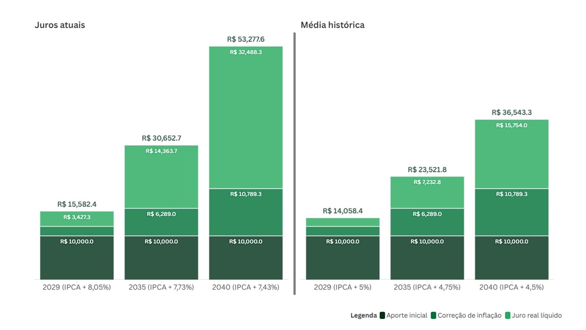 No caso de um juro real menor no mesmo título, de 4,75%, o retorno ainda é significativo, mas “só” dobra. O ganho líquido total cairia para R$ 13.521,77.