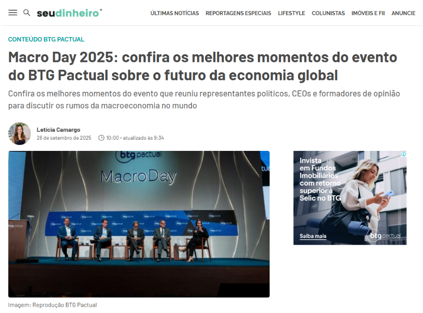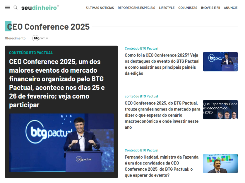 Em 2025, o portal realizou a cobertura de três eventos corporativos do BTG Pactual por meio de parceria comercial: Agroforum, CEO Conference e Macro Day, realizados entre os meses de fevereiro e setembro deste ano.