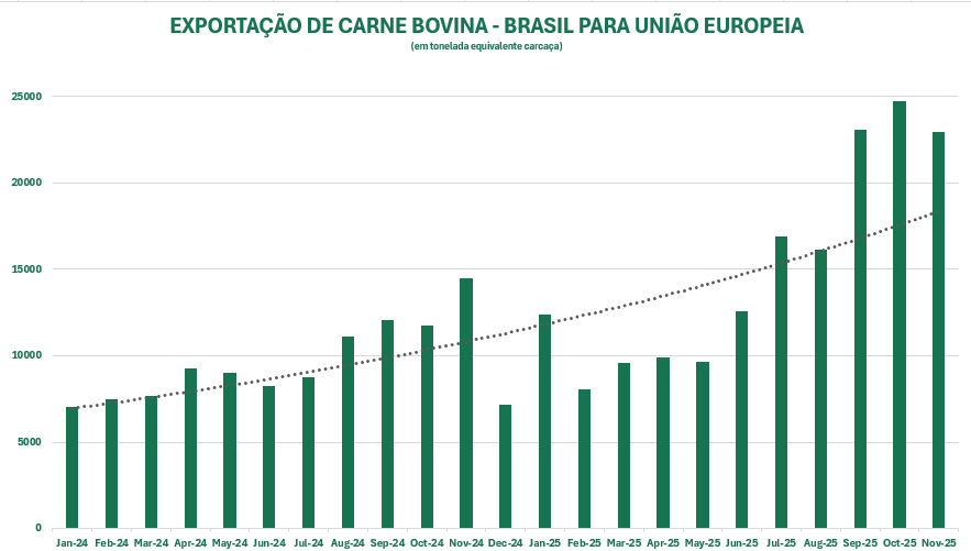 Isso porque o produto é destaque importante na pauta exportadora para o bloco europeu. Entre janeiro e novembro de 2025, o volume de exportações para o continente bateu US$ 820,15 milhões, um salto de 83,2% em relação ao mesmo período de 2024. A UE fica atrás só da China quando o assunto é esse.