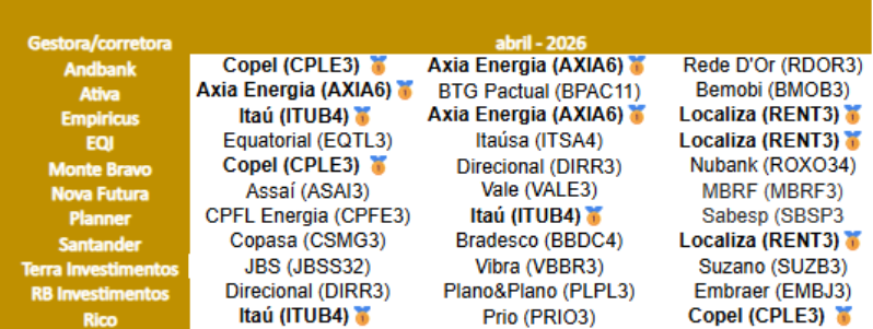 Porém a Axia Energia não reina sozinha no setor elétrico e teve que abrir espaço para uma outra empresa. Com três indicações, a Copel (CPLE3) também ficou entre as favoritas dos analistas com a promessa de dividendos mais robustos em meio à alta dos preços da conta de luz.
