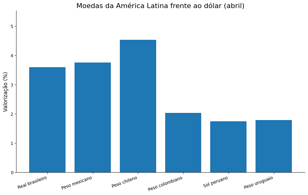 Embora a moeda esteja se desvalorizando globalmente — com perdas de 1,8% no DXY, que mede a força do dólar em relação a outras divisas —, o real tem sido um dos grandes vencedores, acompanhando o movimento de algumas outras moedas emergentes.