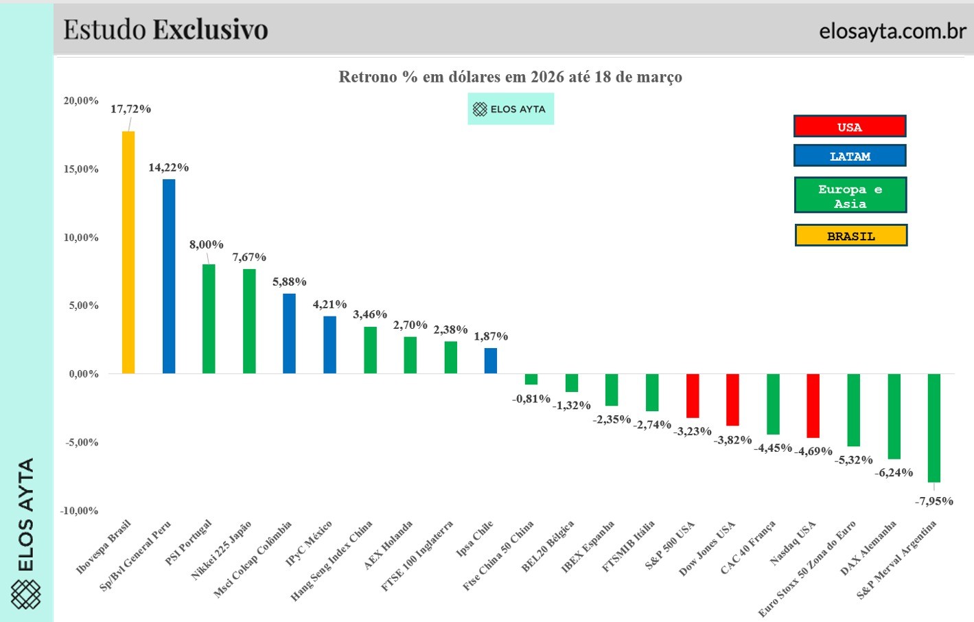 Os dados são da consultoria Elos Ayta e consideram o desempenho em dólar de 21 dos principais índices globais, até 18 de março de 2026.