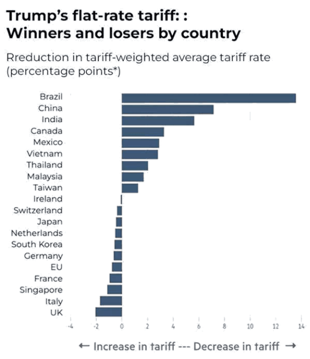 O gráfico do Financial Times ilustra esse movimento ao mostrar a variação na tarifa média efetiva ponderada pelo comércio após a adoção da taxa uniforme de 15%. As barras à direita indicam países beneficiados, com redução da tarifa média; à esquerda, aqueles que passam a pagar mais.