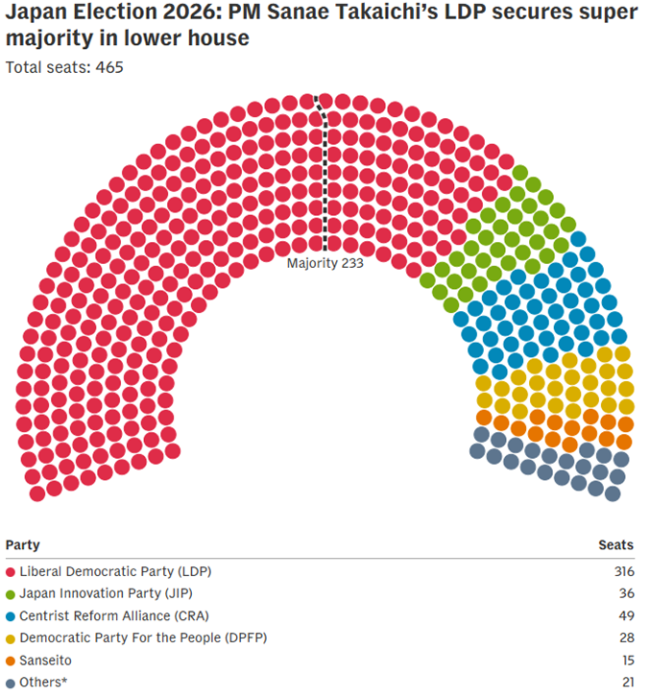 A dimensão do sucesso eleitoral de Takaichi é difícil de superestimar. O Partido Liberal Democrata obteve uma vitória tão ampla que, em alguns distritos, chegou a faltar candidatos para ocupar todas as cadeiras conquistadas.