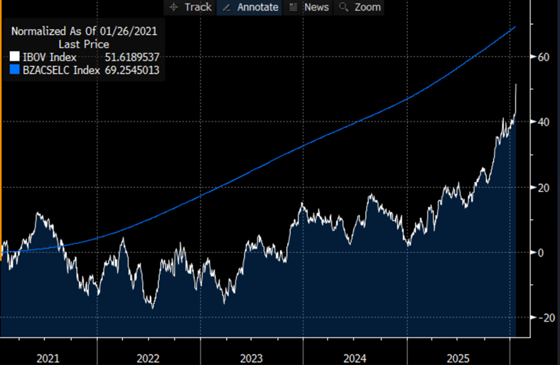 Mas no mercado as coisas podem mudar rapidamente. Um conflito geopolítico, uma agenda menos truculenta de Trump ou uma piora do sentimento com as eleições e o fiscal no Brasil podem mudar drasticamente o cenário base de 2026.