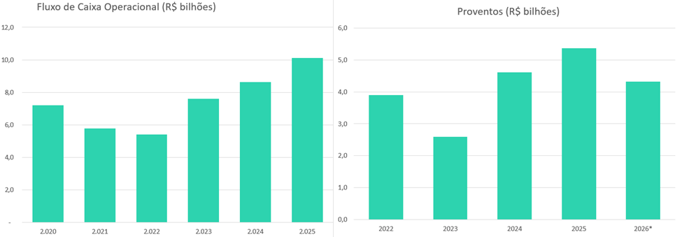 A queda vista nos proventos de 2026 acontece porque a barra só considera o primeiro trimestre (o JCP de R$ 325 anunciado em fevereiro e a proposta de redução de capital de R$ 4 bilhões, que será votada em março). Ou seja, 2026 mal começou e já mostra que terá boas chances de superar o ano anterior.