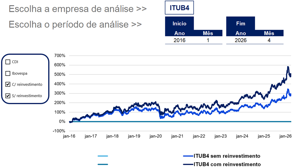 Na ferramenta abaixo comparamos os retornos de quem possuía ações do Itaú e reinvestiu os dividendos recebidos nas próprias ações do banco ao longo dos últimos 10 anos (ITUB4 com reinvestimento) com quem não reinvestiu (ITUB4 sem reinvestimento).