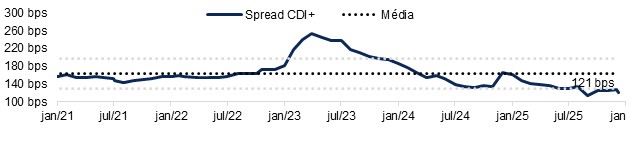 A expectativa de cortes da Selic ao longo de 2026 melhora o horizonte para o crédito privado. Juros mais baixos tendem a aliviar despesas financeiras, melhorar métricas de cobertura e reduzir o risco de eventos de crédito (inadimplência). Trata-se, porém, de uma melhora prospectiva, cuja antecipação nos preços comprime o prêmio de risco disponível.