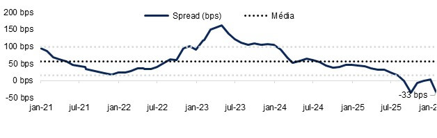 Os números ajudam a ilustrar o ponto. Em janeiro, os spreads apresentaram fechamento relevante em relação ao fim de dezembro.