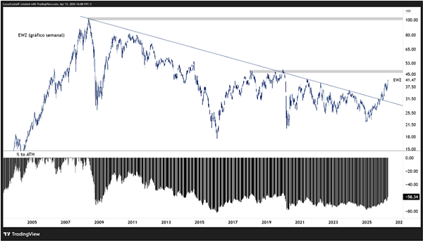O EWZ — análogo a um Ibovespa em dólares — ainda está cerca de 60% abaixo do all time high de maio de 2008 (102,21).