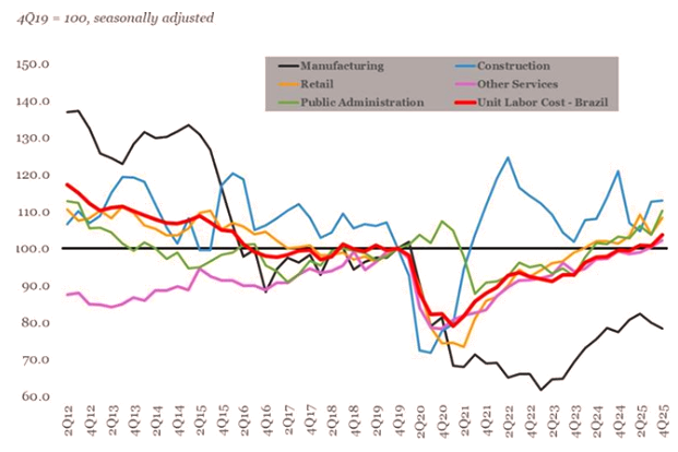 Em particular, o chamado “unit labor cost” (salário/produtividade) vinha em movimento de compensação desde a pandemia, mas agora acaba de cruzar a marca d’água — o que sugere reação via desemprego.