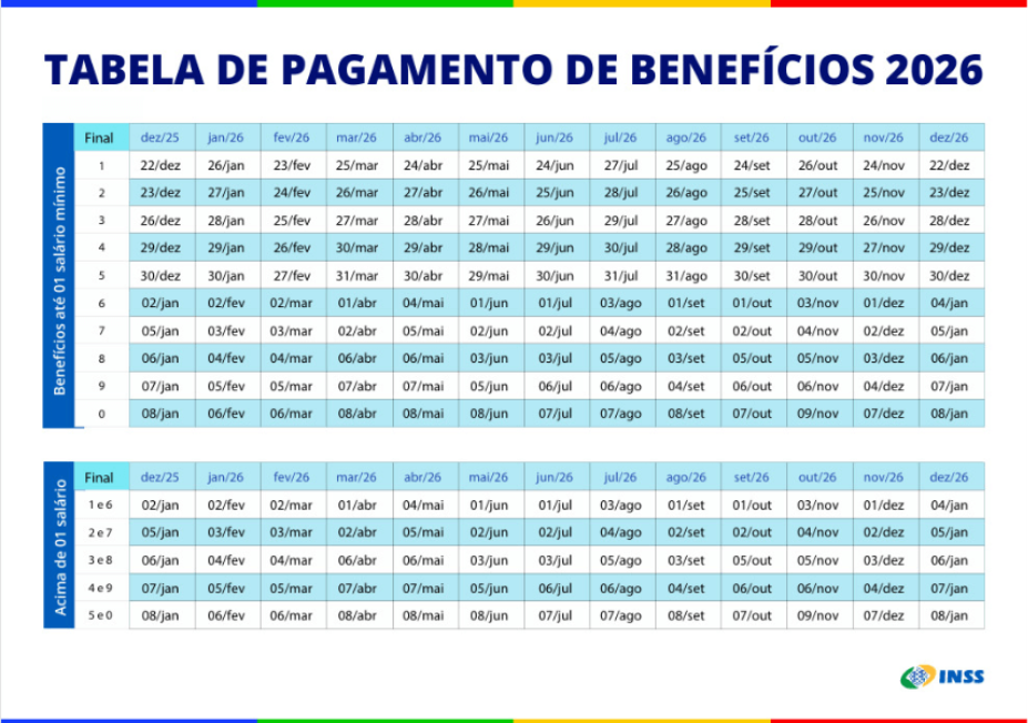 O valor do BPC corresponde sempre a um salário-mínimo. Já os depósitos do INSS seguem dois critérios principais: o valor do benefício (até um salário-mínimo ou acima desse valor) e o número final do cartão do benefício, sem considerar o dígito após o traço. Ambos os pagamentos já incluem o reajuste do salário-mínimo que entrou em vigor no início deste ano.