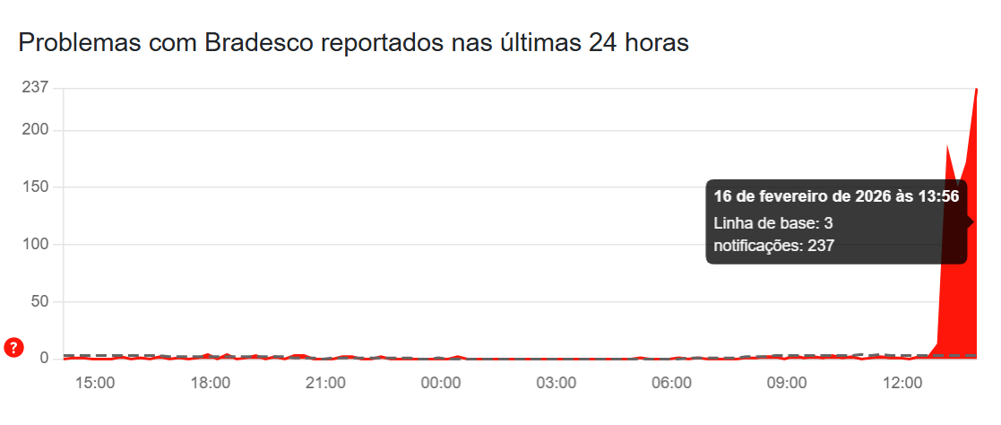 Os problemas na plataforma do Bradesco começaram por volta das 13h10 de hoje, segundo dados do site DownDetector