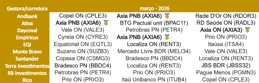 Foram quatro indicações no total — três delas para as ações preferenciais (AXIA6) e uma para os papéis ordinários (AXIA3).